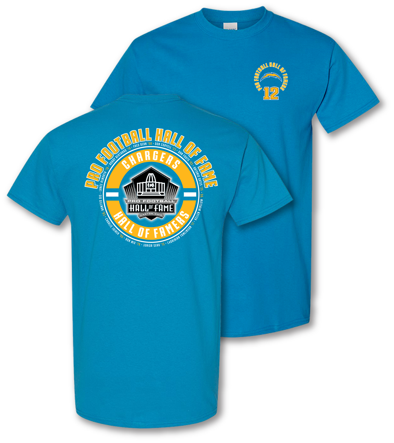 Celebrate the Chargers Hall of Famers with this exclusive. one-of-a-kind. team color. t-shirt from the Pro Football Hall of Fame!